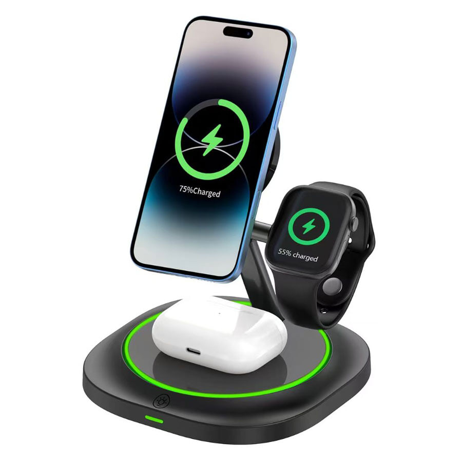 Den gør det muligt at oplade tre enheder på én gang – din iPhone, dit Apple Watch og dine AirPods – helt uden kabler.