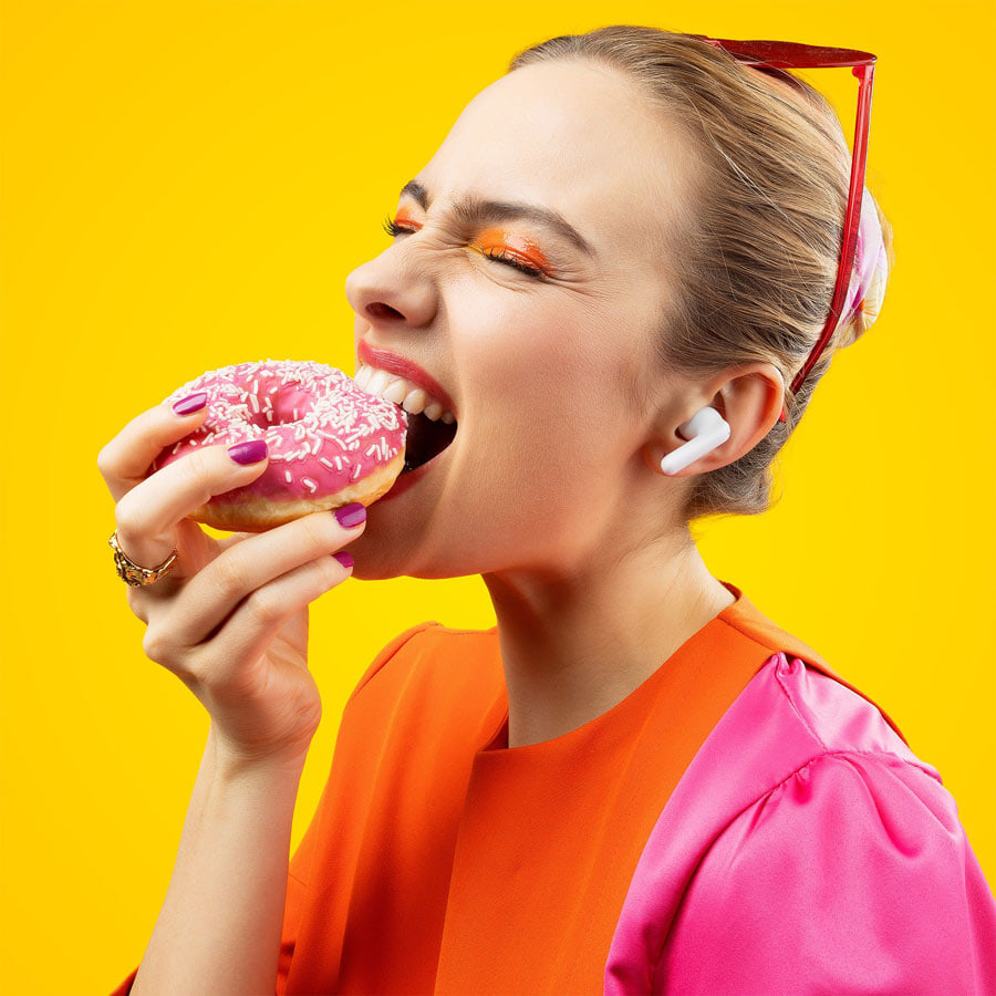 Den lange batterilevetid kombineret med opladningsetuiet sikrer drift hele dagen og gør høretelefonerne til et oplagt valg til både pendling og rejser.
